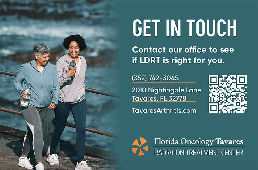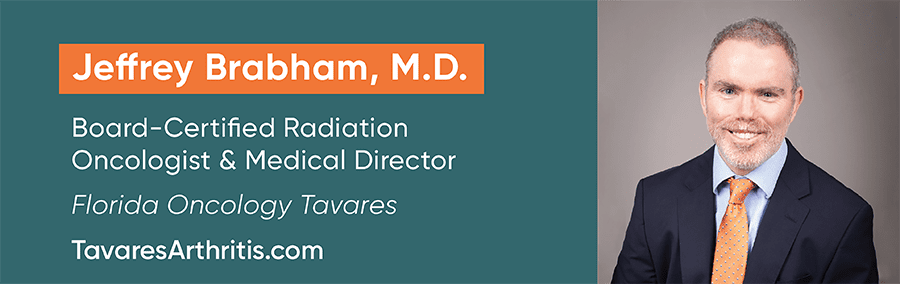 LDRT often helps reduce patients’ need for NSAID pain relievers. It can even defer the need for joint replacement in some cases. The treatment is precise, targeting only the affected portions of the body. LDRT can be used to treat most affected joints, including hips, shoulders, knees, elbow, ankles, feet, and hands. Dr. Jeffrey Brabham, Board-Certified Radiation Oncologist and Medical Director at Florida Oncology Tavares, said “I am encouraged by the new treatment for patients who are looking for a novel approach to pain relief. The research is clear and the results are consistent across patients with a variety of inflammatory complaints. We are seeing a great deal of success with LDRT and it is improving quality of life for our patients.” Dr. Brabham also stated, “the treatments are short and simple with no impact to daily activities. LDRT is proving to be a great treatment option for many painful inflammatory conditions. Since it is a relatively new option, we want patients to know that this is available and accessible. You can contact our practice for a consultation to see if LDRT is right for you.”