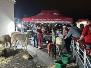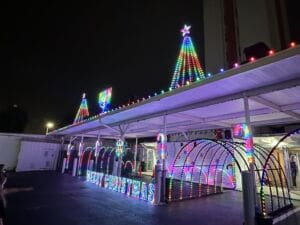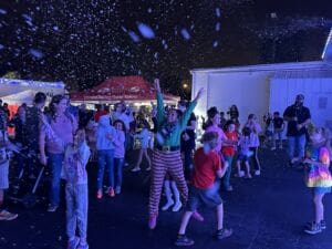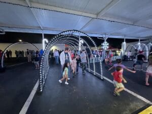 Families lined up with toys in hand, earning a free ride to the top of the tower before gathering on the lawn for food trucks, photos, a caricature artist and face painting by Jen Abston and her crew, Dream Catcher Horse Ranch’s petting zoo and performances from a Lake County community choir. Once dark, radio host Brian Grimes of XL 106.7’s “Johnny’s House” stepped in to flip the switch on Jay Peterson’s dazzling light show complete with snow and glowing arches kids excitedly ran through on repeat.