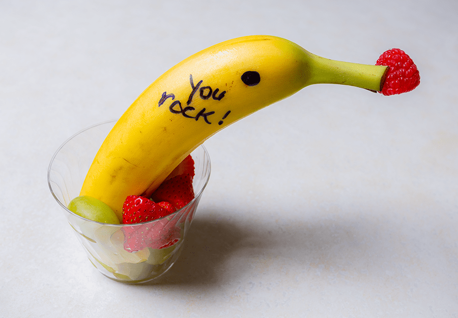 These days, Theresa makes fruit and veggie trays using cookie cutters to cut shapes from cheese, watermelon and even cucumbers. She laughs when she talks about the little banana shaped like a dolphin that holds a sign saying, ‘You rock.’
