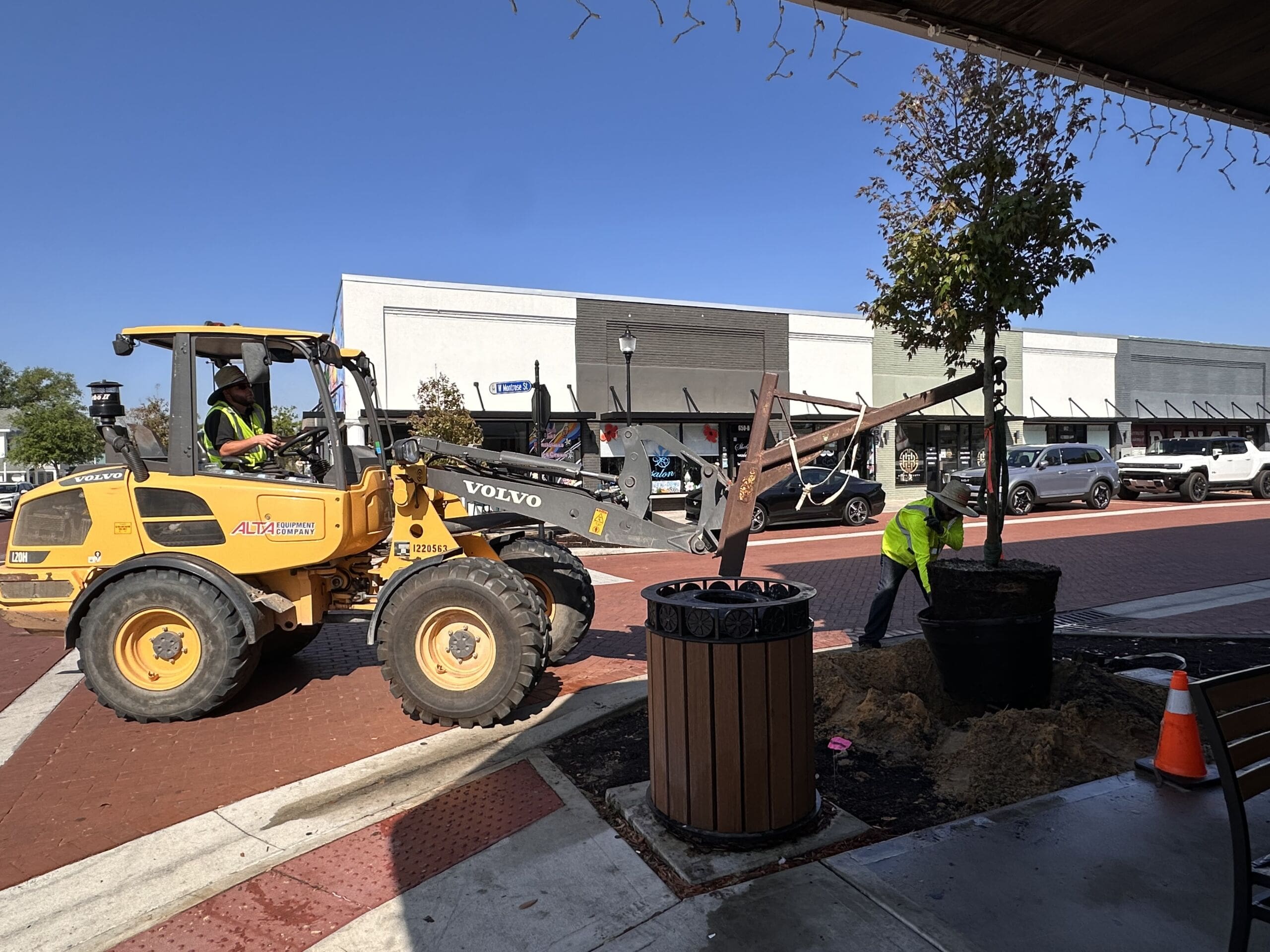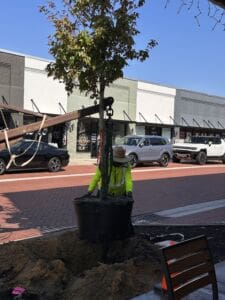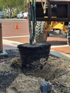 What Natalie’s referring to is a new streetscaping project led by Clermont Main Street, the city of Clermont and Cherry Lake Tree Farm that’s now underway with installation of maturing trees that began this week along Montrose Street.