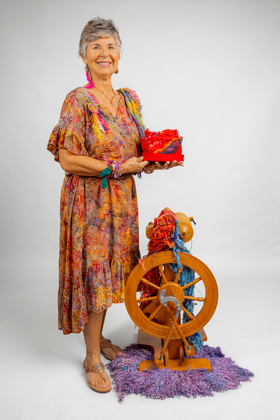 In her Pine Rock Park Studio, she spins and processes her own wool to incorporate into her fiber creations.