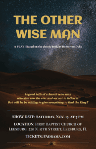 First Academy-Leesburg is inviting the community to celebrate the holiday season with its upcoming theatrical production of “The Other Wise Man,” a Christmas story based on the 1895 book by Henry van Dyke and dramatized by Ruth Sergel in 1955. The performance will take place on Saturday, November 15 at 7 p.m. at First Baptist Church of Leesburg, 220 N. 13th St. Tickets are available now at FADrama.com.