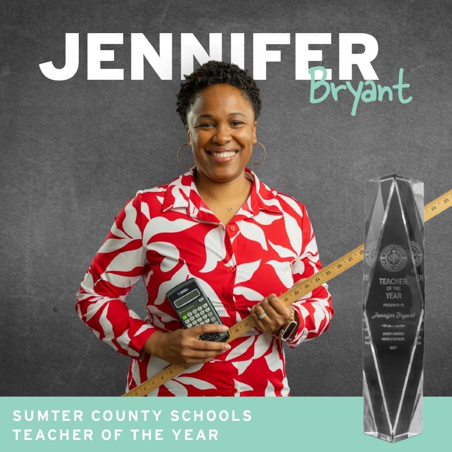 That steady commitment has not gone unnoticed. Jennifer was named both South Sumter Middle School Teacher of the Year and Sumter County School District Teacher of the Year for 2026-27.