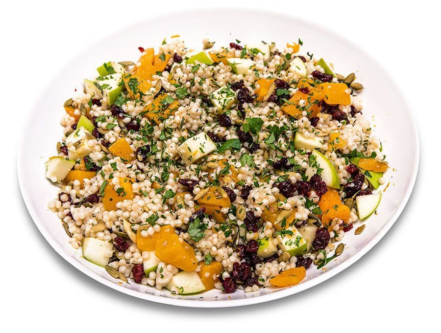 Preheat oven to 350 degrees. Cut butternut squash in half, carefully peel and remove seeds and cut into 1-inch dice. Toss squash in a large mixing bowl with 2 tablespoons of olive oil and season with salt and pepper. Place squash on a baking sheet and roast in the oven for 30-45 minutes until squash is soft but not mushy. Set aside. (You should be able to easily pierce with the tip of a sharp knife). While the squash is roasting heat 2 tablespoons of olive oil in a medium saucepan on medium-high heat. Add the couscous and cook, stirring occasionally with a wooden spoon until slightly brown, about 3 to 5 minutes. Add the vegetable broth and bring to a boil. Reduce heat and simmer for 10 minutes or until the liquid has fully evaporated. Transfer the cooked couscous to a large bowl. Toss in parsley, rosemary, thyme, apple, dried cranberries, squash and pumpkin seeds. In a small bowl, whisk together the vinegar, orange zest, orange juice, honey, salt, and pepper. Slowly whisk in the olive oil until fully combined. Pour the vinaigrette over the couscous and toss to coat evenly.