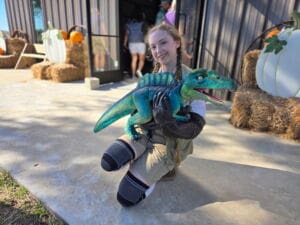“It’s a way to get families out to the farm,” she says. “The dinosaur theme is always popular and I have seen whole families wearing dinosaur shirts and says many come early and stay until closing.”