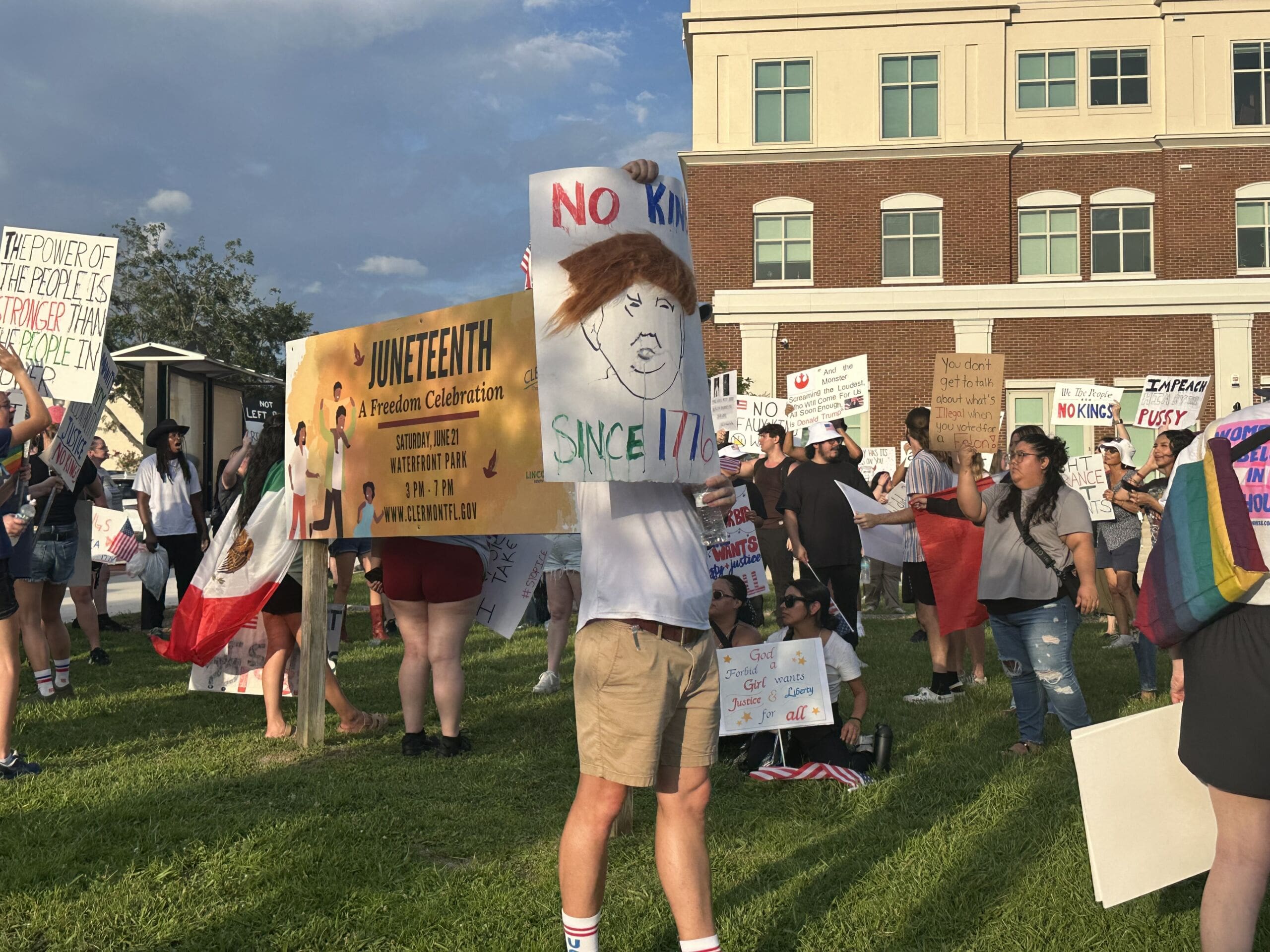 (Protesters in Clermont holding up No Kings protest signs.)