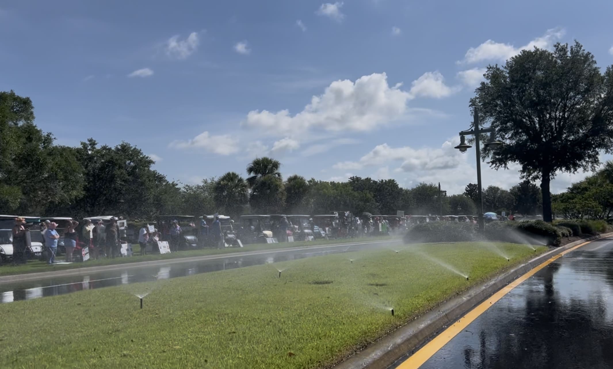 (Sprinkers ran during the protests in The Villages. These were turned on in the middle of the median.)