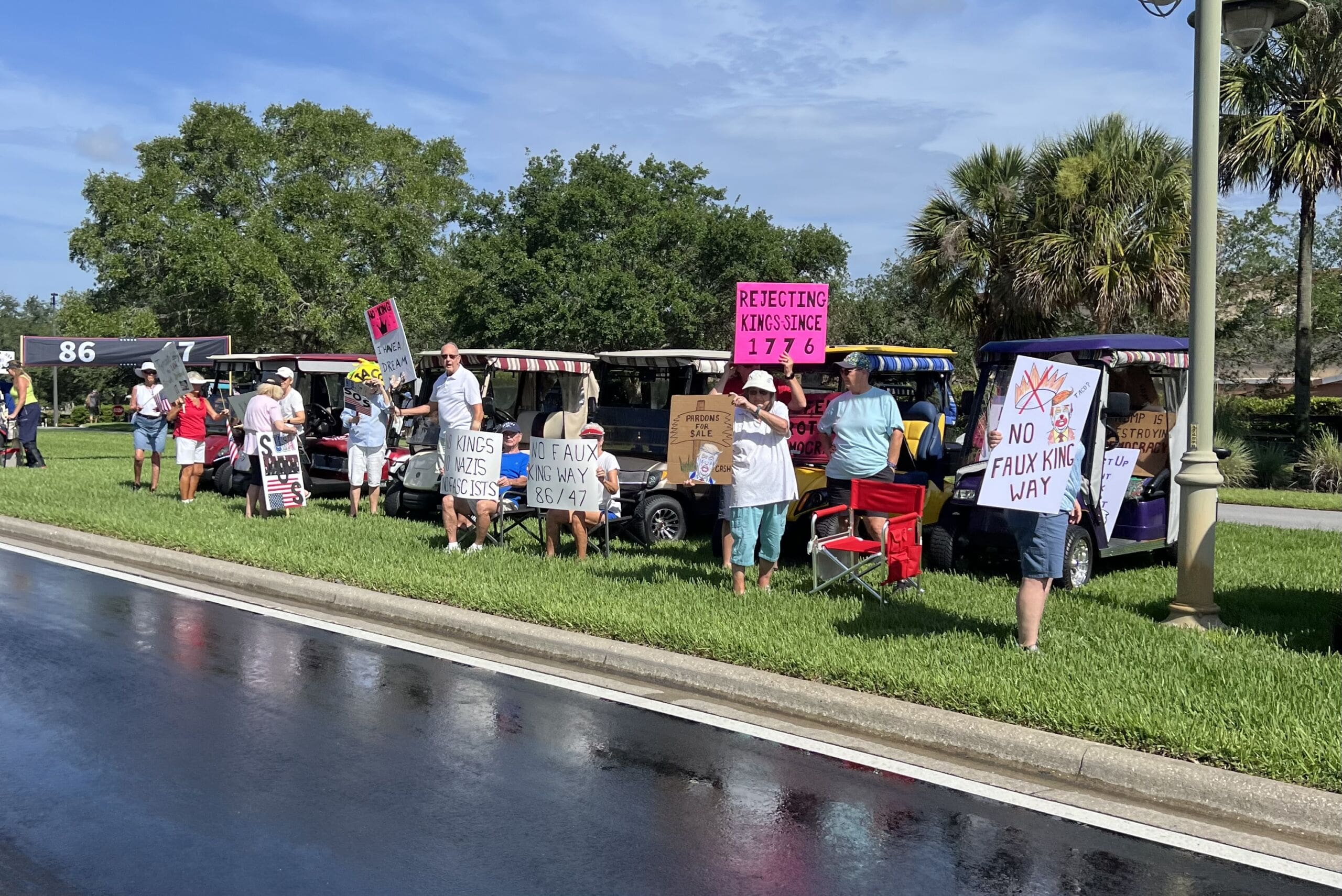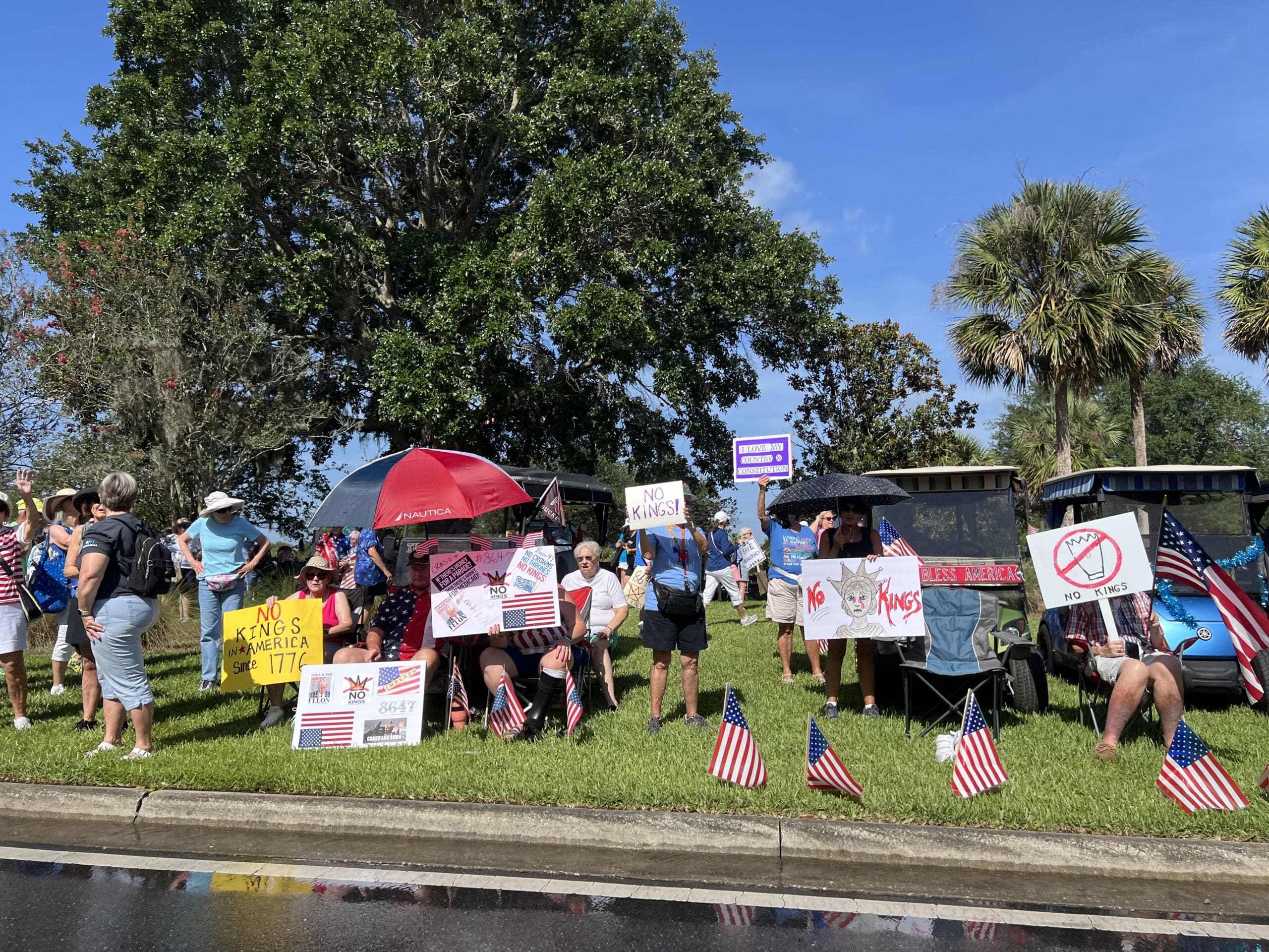 Demonstrators began arriving before 10 a.m. and lined Morse Boulevard near the entrance to Lake Sumter Landing. As the morning progressed, the crowd was estimated to be around three thousand people. Sprinklers turned on in the median and protesters remained undeterred, standing along the roadways and making their voices heard without blocking traffic or engaging in confrontational behavior.