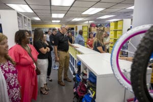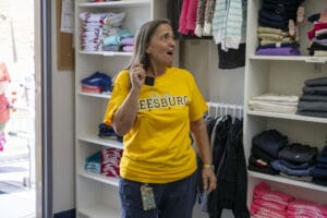 Florence, who has worked for years to serve the needs of students and families at Leesburg Elementary, previously relied on discarded shelving and furniture to build out her original pantry. The room was functional, but far from ideal. Now, it includes brand-new shelving, racks, a changing room, labeled bins for clothing and shoes, a dedicated desk area and even a bike rack.