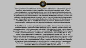 Officials also stressed that the court’s decision does not mean open carry will be without restrictions. State law continues to prohibit firearms in certain places, including schools, government meetings, courthouses, and police or sheriff’s offices under F.S. 790.06(12)(a). In addition, firearms may not be carried “in a rude or careless manner,” according to F.S. 790.10.