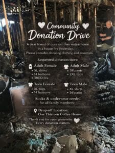 Donations may be dropped off at either of the two locations. Organizers say the goal is to help bridge the gap while the family works through longer-term recovery and insurance claims.