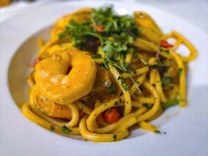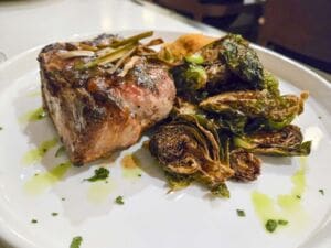 The heritage pork chop was tender and juicy served with sweet potato purée and apple-bacon jam. The real surprise was the oven-roasted Brussels sprouts, charred just enough to stay crisp. The shrimp and chorizo bucatini was creamy with a small kick of heat.
