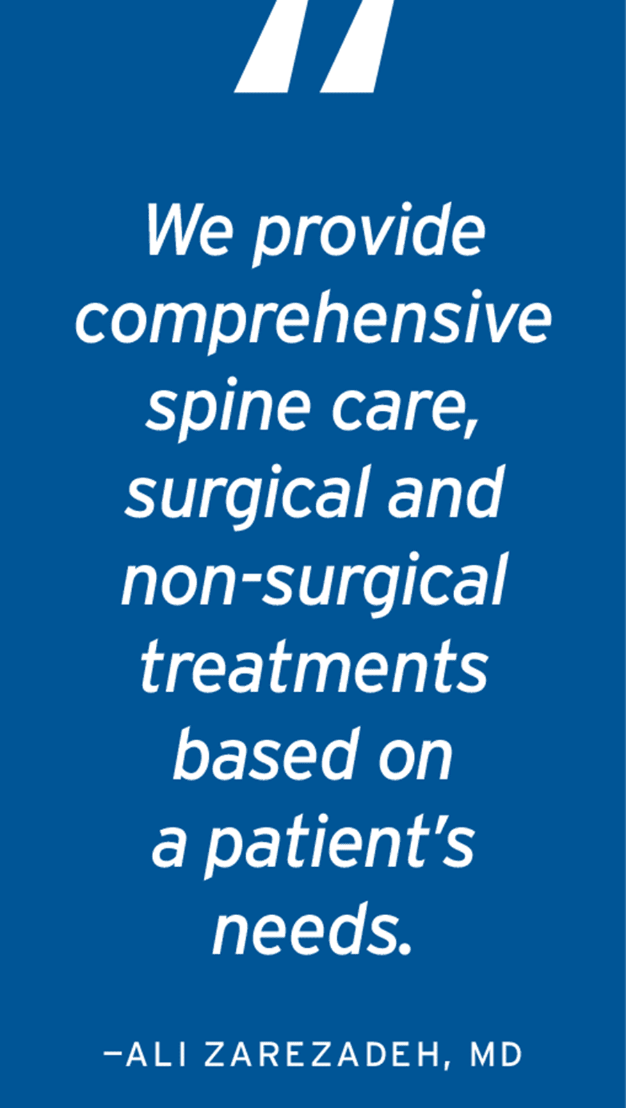 “We are a well-trained team composed of different members, from schedulers, nurses and radiology techs to physical therapists, pain management doctors and spine surgeons. All of us work together to provide a comprehensive approach to personalized care, including surgical and non-surgical options, for patients’ spine problems,” says Dr. Zarezadeh, whom patients often refer to as Dr. Z.
