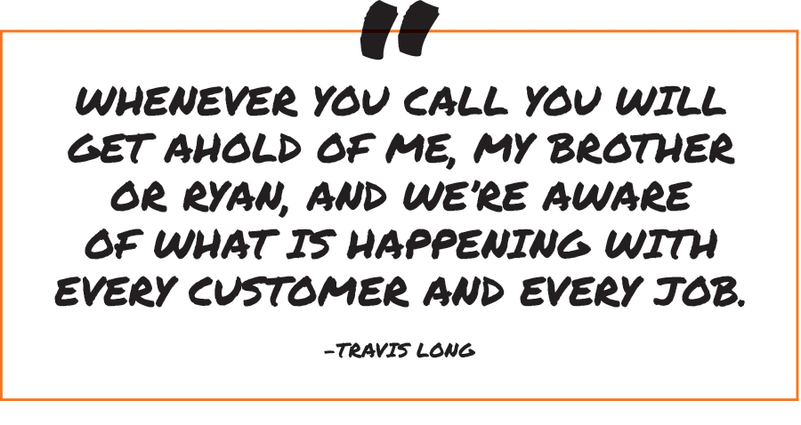 “My business number is my cell number, so it will always be answered. Our customers have immediate access to us; they don’t have to deal with an answering service,” says Travis. “Whenever you call you will get ahold of me, my brother or Ryan, and we’re aware of what is happening with every customer and every job.”