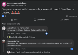 On Feb. 6, Tammy posted a comment on the Facebook page asking if anyone was still owed a refund.