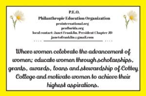 Lake County’s local chapter, Chapter JD, was established in 2016 by longtime member and Florida Past State President Kathy Feldman. The chapter awards scholarships to local graduating high school seniors, in addition to supporting P.E.O.’s seven international projects, which include the Educational Loan Fund, International Peace Scholarship Fund, Program for Continuing Education, Scholar Awards, STAR Scholarships, the P.E.O. Foundation, and Cottey College in Missouri.