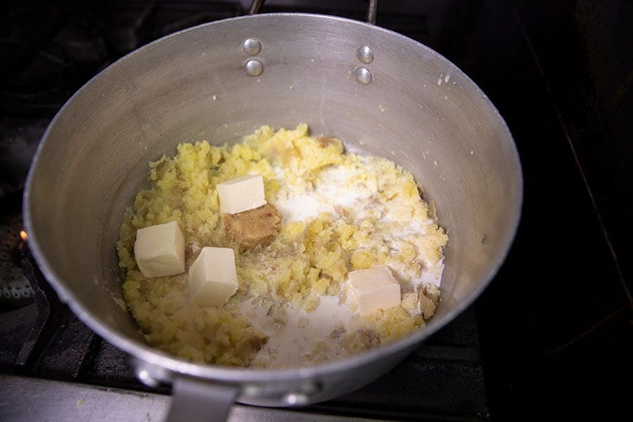 Sauté wild mushrooms with salt, pepper, butter until slightly tender. Set off to side. Coat tuna with black pepper until fully covered. Sear on each side for 30 seconds to 1 minute on each side. Slice tuna against the grain into thin slices. Heat up Alfredo sauce and add chopped tarragon. Place potatoes in a mound in a bowl. Then add cooked mushrooms. Put about 3-4 ounces of sauce on top of mushrooms and potatoes. Add sliced tuna on top.
