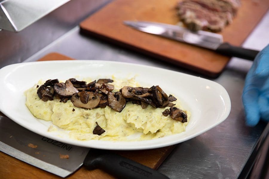 The ahi tuna is enhanced with cracked black pepper and served with roasted wild mushrooms, roasted garlic mash potatoes, creamy garlic tarragon butter sauce and toasted sesame.